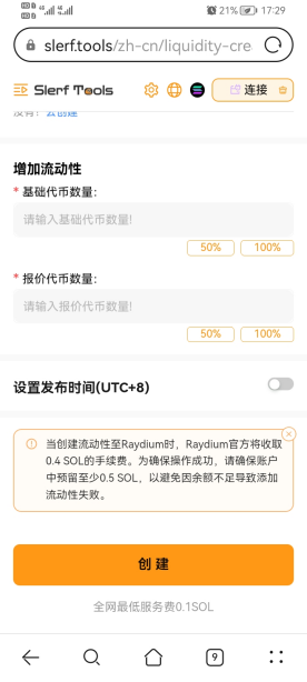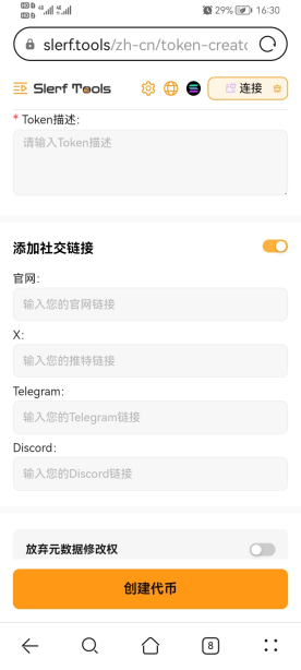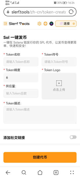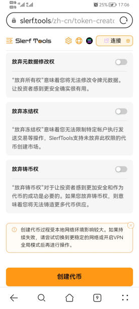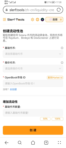 H、如何通过发行代币融资 融资的方式有很多种,比如上市融资,熟人融资,发行代币在全世界融资。发行代币在技术上不难,几分钟即可创建一个代币,但如何让市场认可代币并出钱买下你的代币,才是关键. 一,发行流程 创建代币→创建市场→创建流动性池→市场推广 二,创建代币 创建代币,有一些现成的在线工具比如pandatool,slerftools等,在这些工具平台上几分钟即可创造出一个新的代币。经我多次尝试,以slerf.tools更好用,可成功创建。区块链技术只有一个,但应用这个技术的运营商家有很好,比如以太坊,solana,sui等,以下以我在solana公链上发布zCNH代币为例说明这个过程。 先准备科学上网环境,我用的是clash梯子,买的是狗狗云套餐,可正常使用google网站和gmail邮箱。 然后在手机上下载安装web3技术的钱包APP,因为发代币是要手续费的,会从这个钱包中扣除。我试安装过几十个钱包,唯有solflare可以正常连接使用。 有了钱包就要准备好手续费,整个流程下来约需2个SOL代币(一个sol币值人民币约950元)。所以,我先在OKX交易所用CNY买好USDT,再兑换成SOL然后转帐到solflare钱包中,直接在solflare中没办法用CNY买sol或USDT,只能绕个圈子。 上述准备好了,在手手机上打开slerf.tools网站,如下图:
